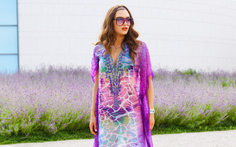 The PRATIMA collection offers stunning pieces in a colorful array of 100% pure silk crepe, chiffon, viscose, cotton, and various other rich fabrics that are luxurious, lightweight and flowing. The pieces are hand and machine embroidered, as well as hand embellished with an endless selection of semi-precious stones, some of which include mother of pearl, crystals, turquoise, diamantes, pearl beads, etc. These elements render luxurious bohemian charm and elegance, with a relaxed vibe. Most of the PRATIMA pieces are limited edition, which in itself reveals uniqueness and a collectible quality.